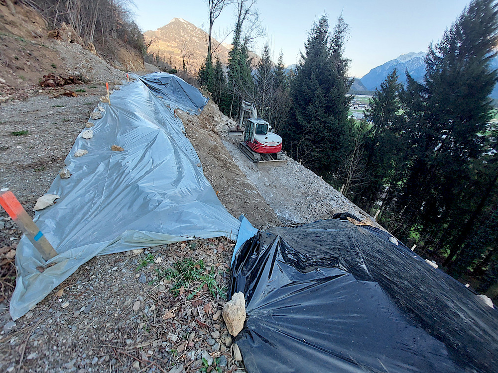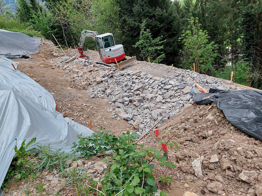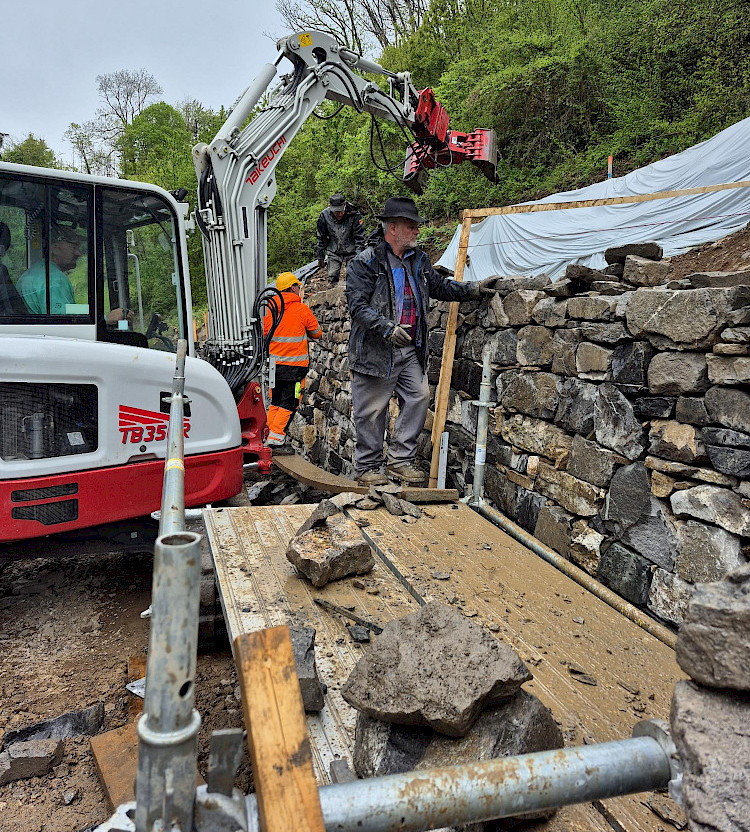 Gleich nach Ostern starteten Mitarbeiter des DLZ Blumenegg mit Unterstützung des Bauhofes Bludesch mit den Vorbereitungen für die nächste Bauetappe. Aufgrund des schlechten Zustandes der Mauer musste der zu sanierende Teil mit einem Bagger komplett abgetragen werden.