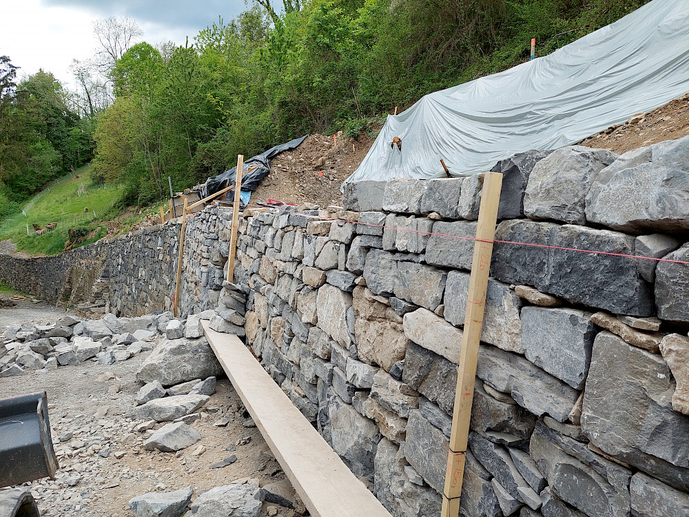 Schwieriges Gelände, große Mauerhöhen und schlechte Witterung stellten große Herausforderungen an alle. Dank guter Vorbereitung, sehr professioneller Leitung und Vermittlung des Fachwissens durch die Kursleiter Felix Riegger, Emmanuel Weber und Martin Lutz herrschte nichtsdestotrotz eine tolle Stimmung an den zwei Baustellen.