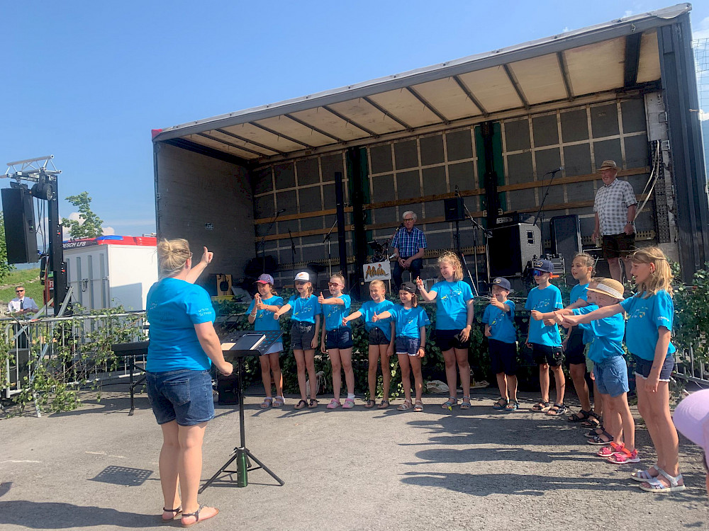 Nur wenige Wochen später, am 5. Juli 2025, traten die Singspatzen erneut auf – dieses Mal beim Florianifest der Feuerwehr Bludesch im Rahmen des diesjährigen Dorffestes am Freizeitplatz. Bei strahlendem Sonnenschein bildete der Auftritt des Kinderchors den musikalischen Abschluss des Schuljahres.