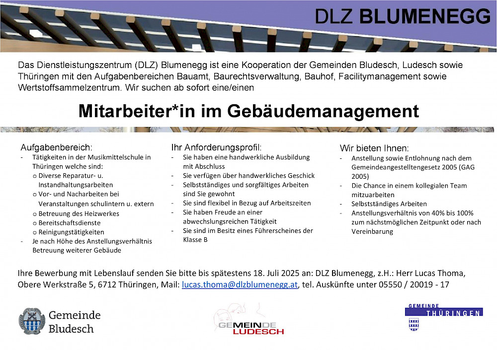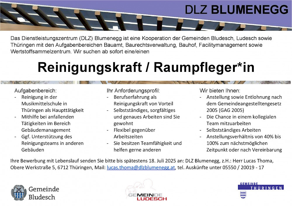 Das DLZ Blumenegg erweitert sein Team und sucht ab sofort motivierte Mitarbeiter:innen in den Bereichen Gebäudemanagement und Reinigung.