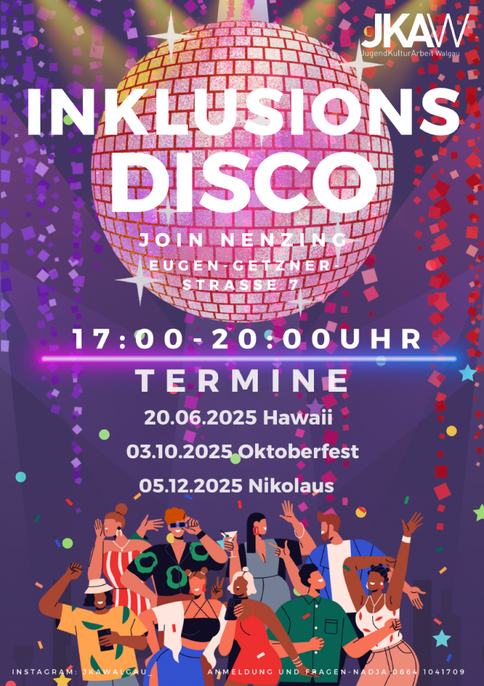 Die Jugend Kultur Arbeit Walgau veranstaltet am die nächste Inklusionsdisco am Freitag, den 20.06.2025 die nächste Inklusions-Disco!