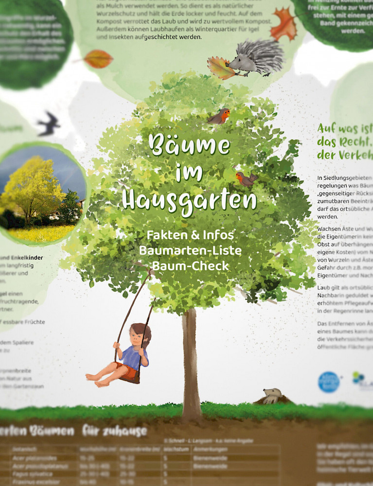 Die Klimawandelanpassungs-Modellregion KLAR! Im Walgau möchte daher das Bewusstsein für die Bedeutung von Bäumen schärfen. Ihre neue Baumbroschüre im praktischen Poster Format beantwortet Fragen wie: „Welche Baumart passt in meinen kleinen Garten? Soll ich den alten Baum fällen oder hat er noch eine Chance? Was tun mit dem vielen Laub? Welche rechtlichen Aspekte an der Grundstücksgrenze sind zu beachten?“